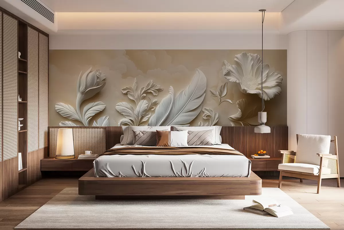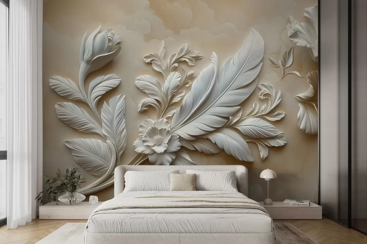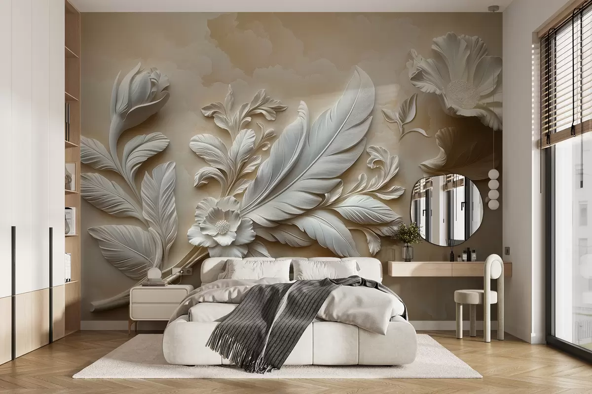 Фототапет Грациозни релефни цветя с листа и пера в бежови тонове Nr w01355