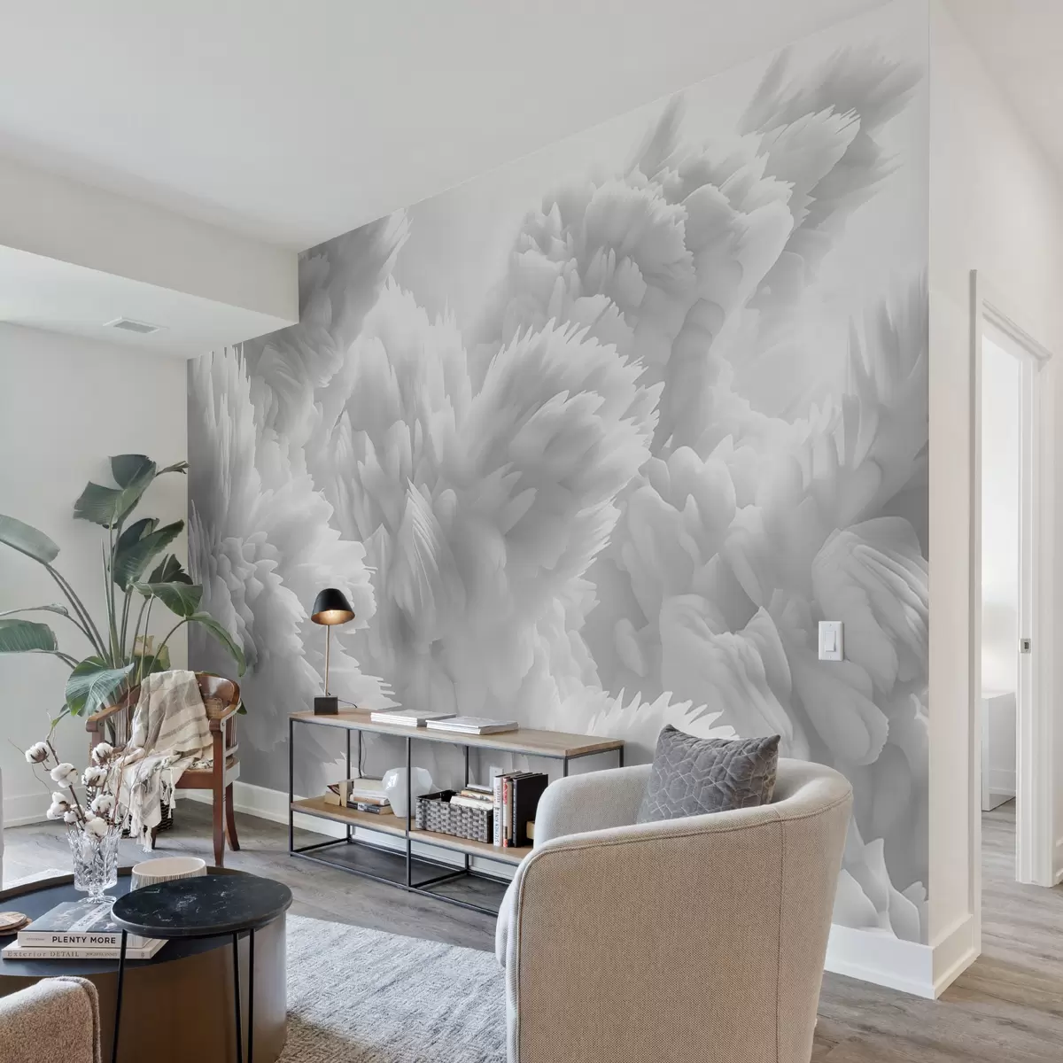 Фототапет Абстрактна композиция от снежни кристали в многопластова шарка от пера в ефирна атмосфера Nr w01474