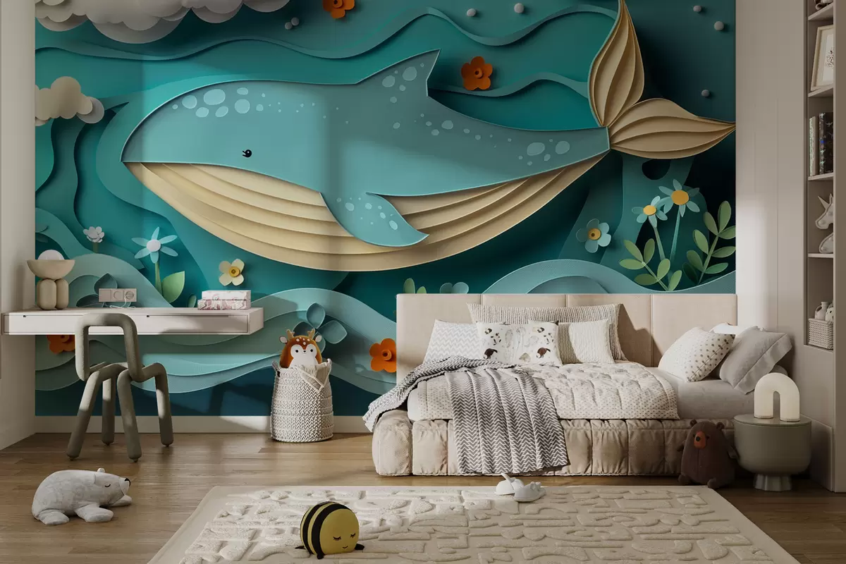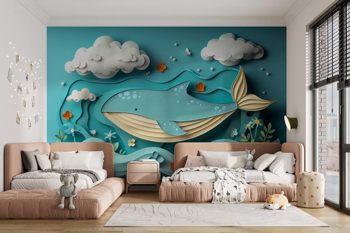 Фототапет Игрив кит в облаците в стил хартия, 3D ефект Nr w01496