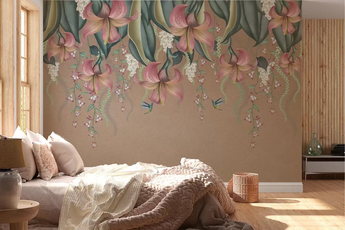 Фототапет Деликатен ботанически мотив с висящи лилии, цветя и колибрита върху гръндж стена Nr w01523