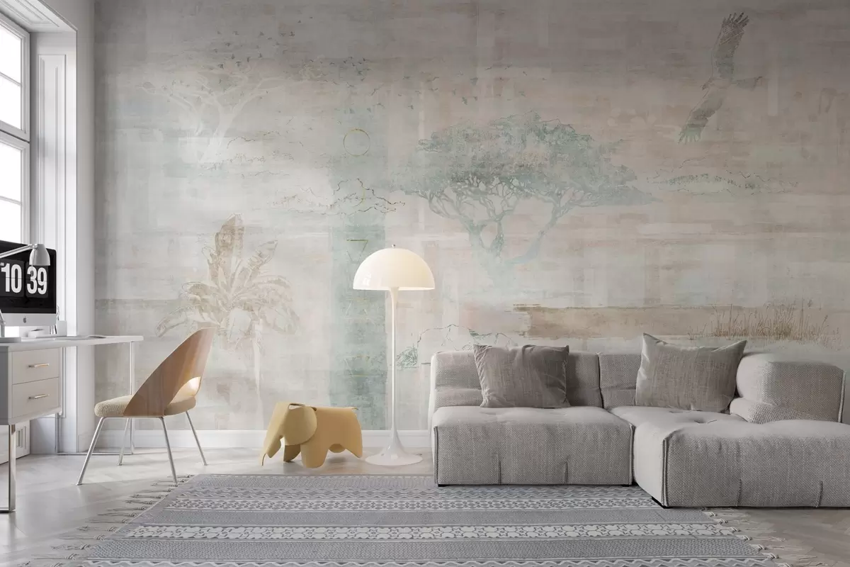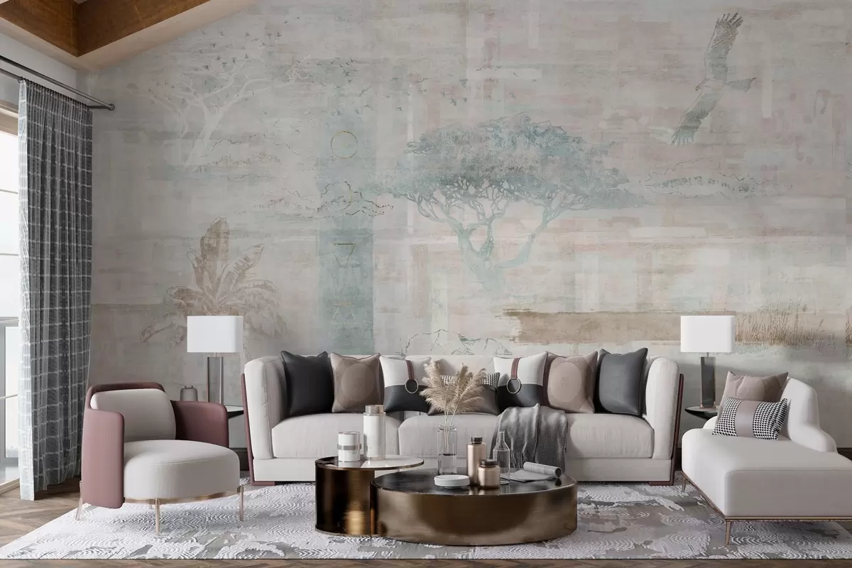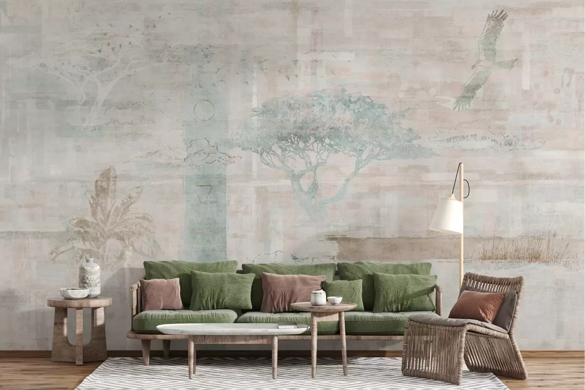 Фототапет Реколта гръндж ефект дизайн с дървета, орел и геометрични елементи w02130