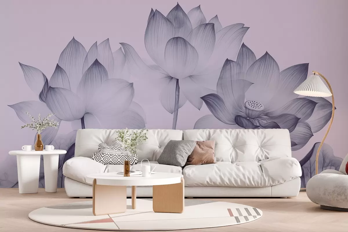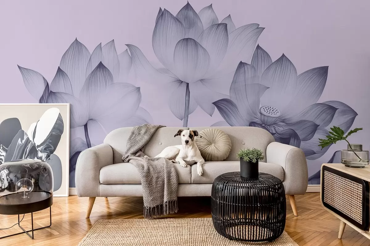 Фототапет Три лотоса с листа в стила на китайската живопис в син цвят Nr w02146v2
