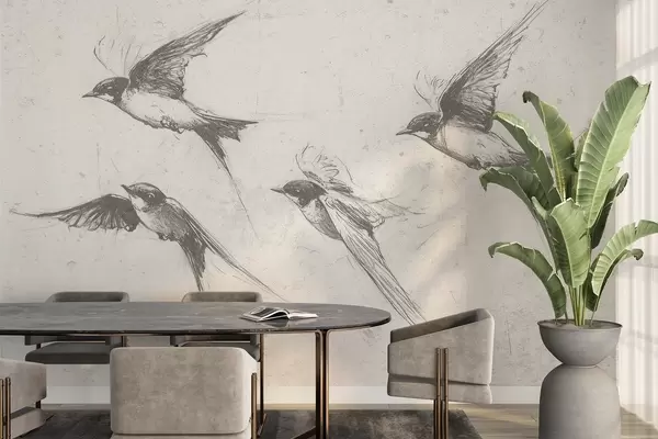 Фототапет Летящи птици, рисунка с туш, минимализъм, сиви цветове Nr w02155