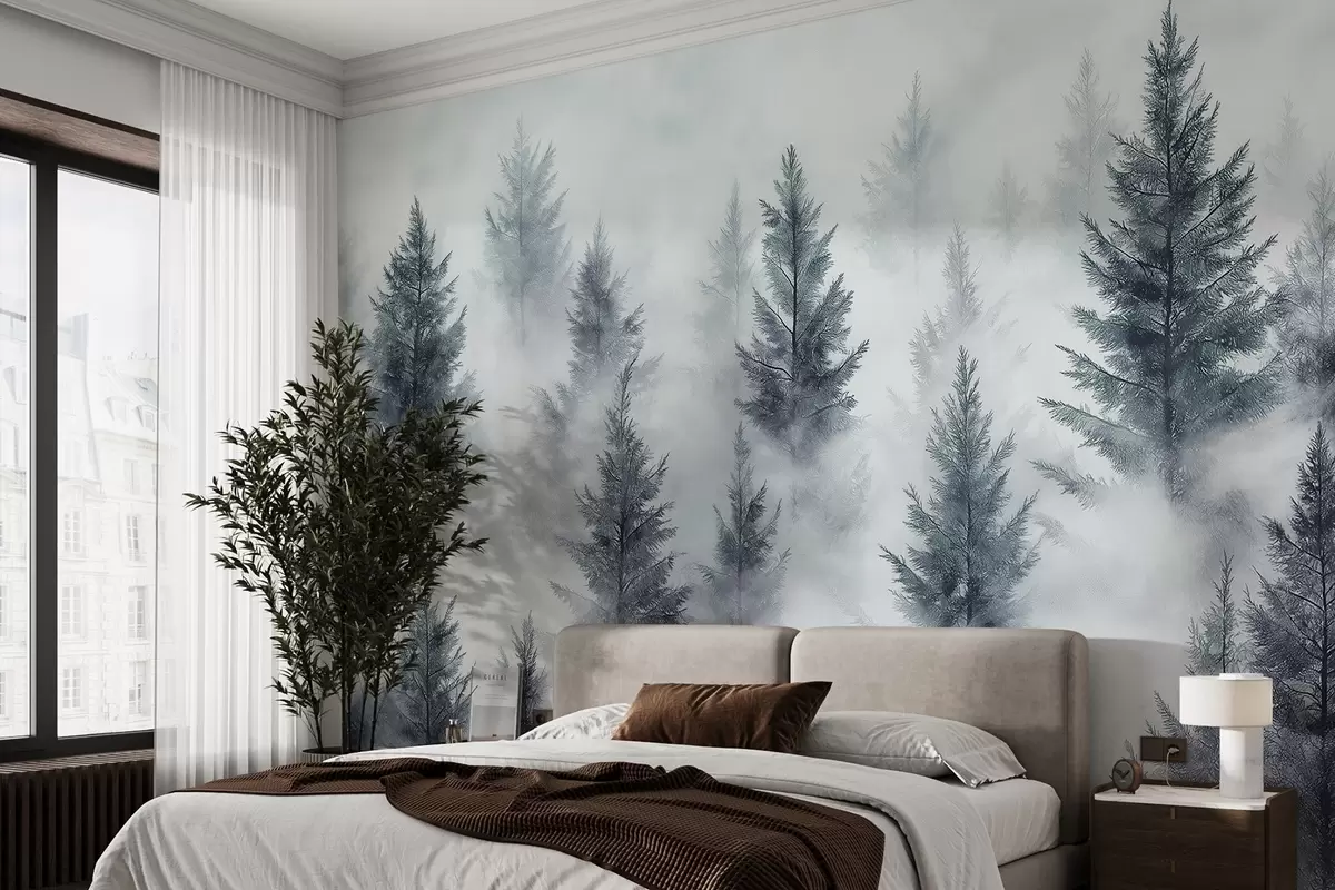 Фототапет Красива гора с борови дървета, мъгла, природни пейзажи, сиви цветове Nr w02222v2