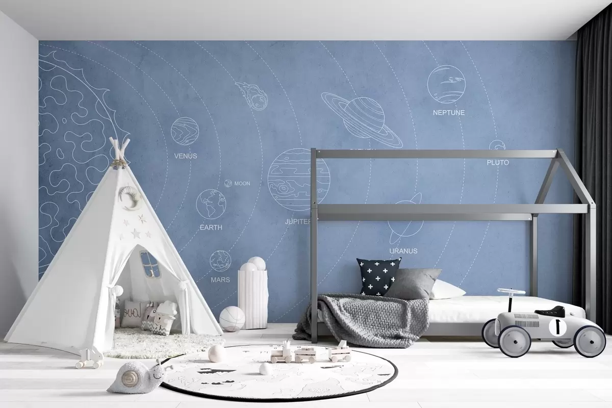 Фототапет Слънчева система в минималистичен стил на син текстуриран фон Nr w02344v1