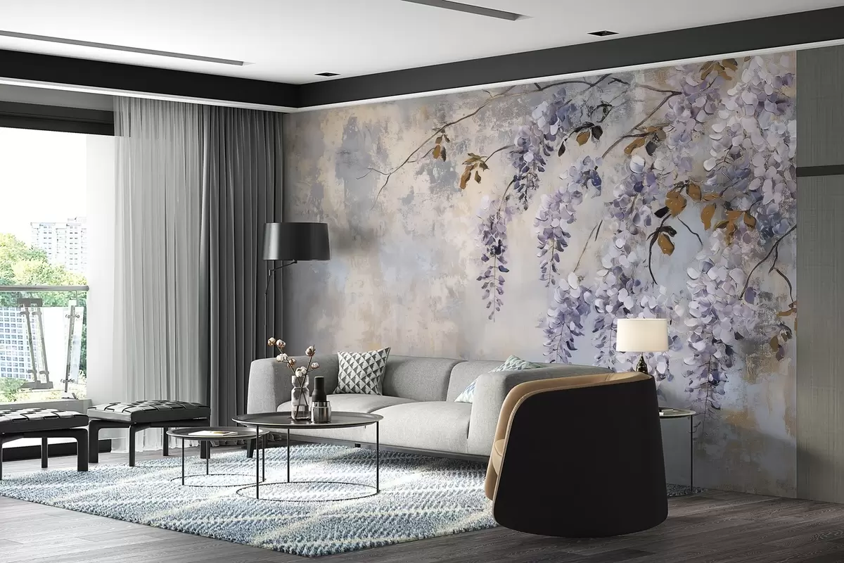 Фототапет текстуриран тапет в меки, приглушени цветове с деликатни цветя и клонки на глициния. Nr w02451