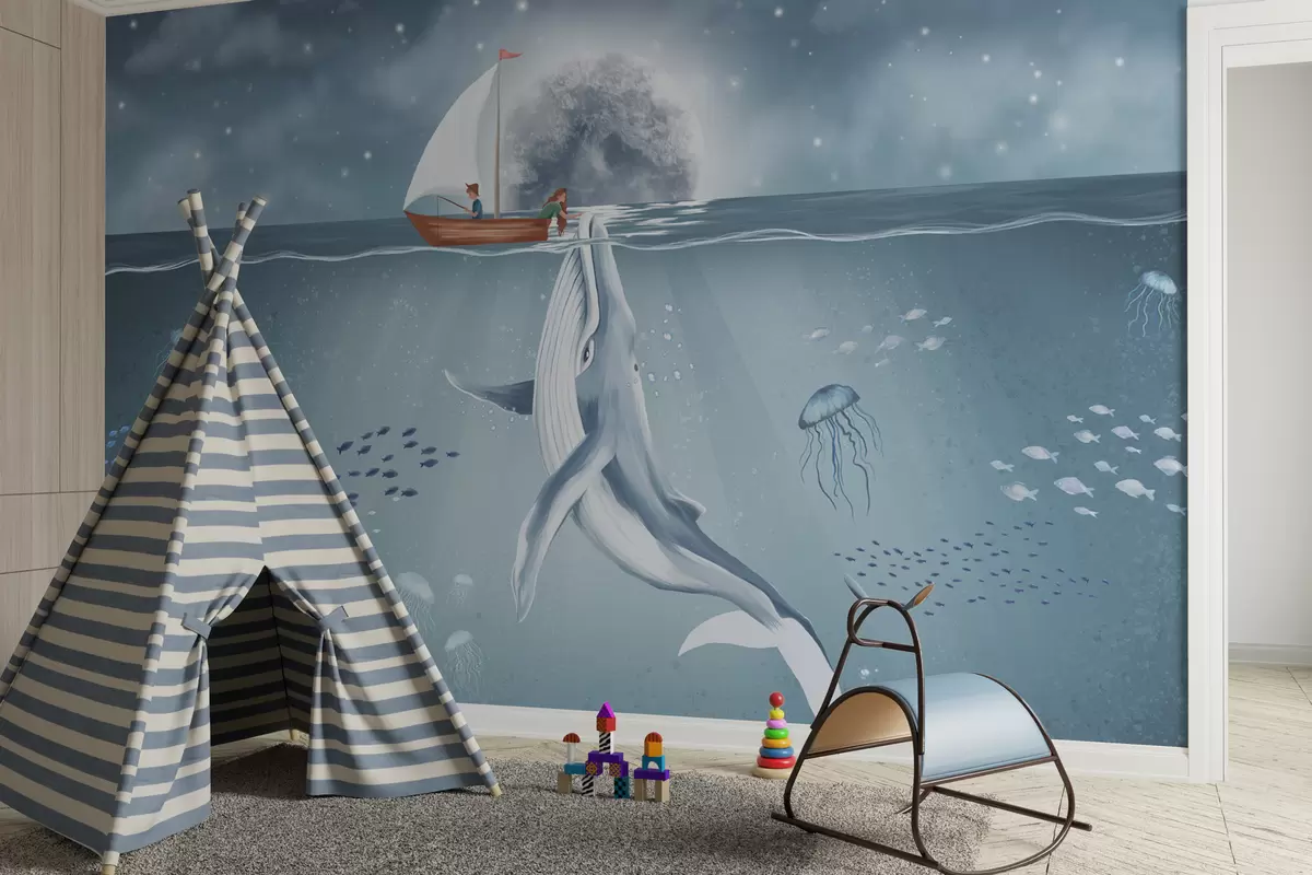 Фототапет Детски дизайн с кит, луна и лодка с деца Nr w02476