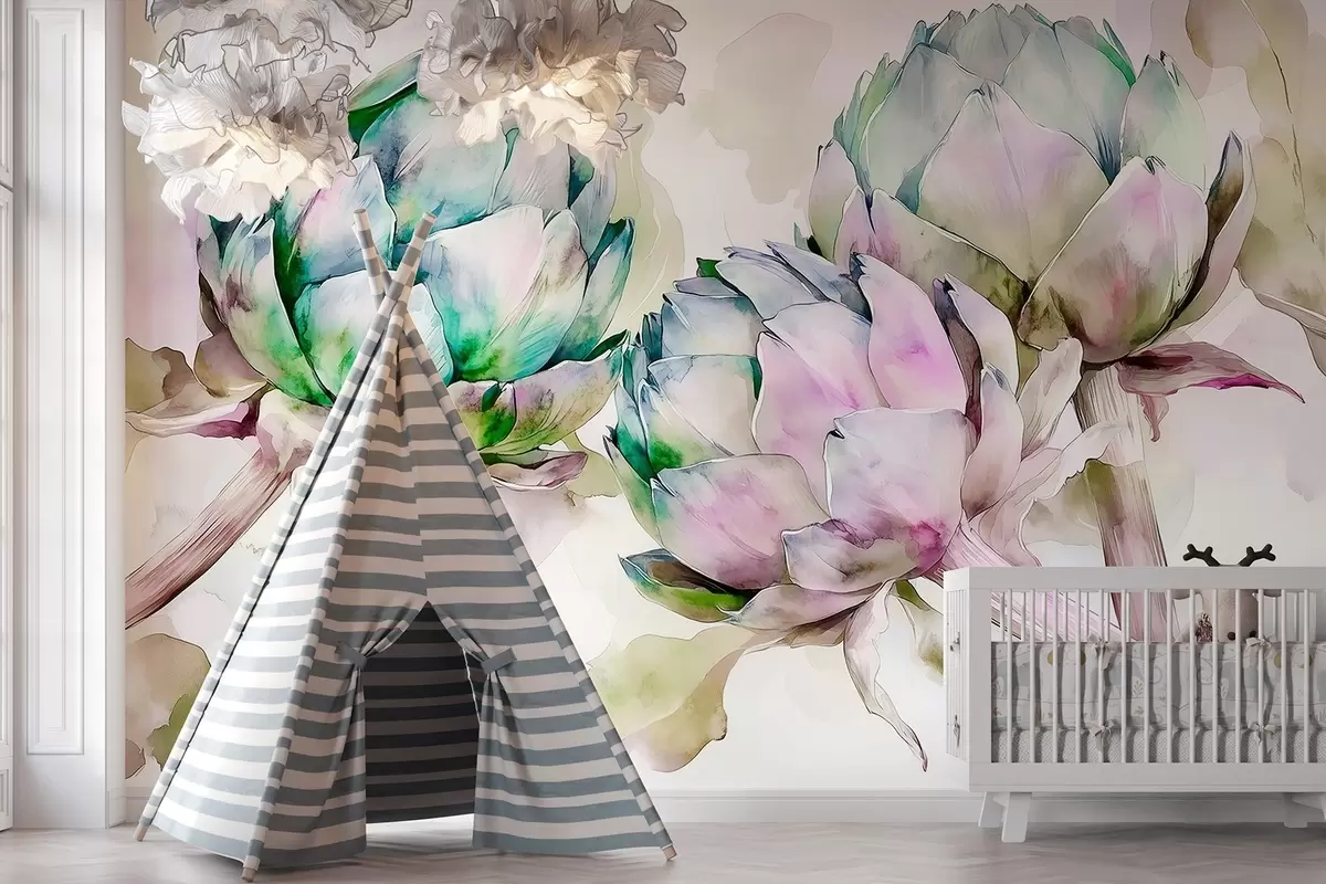 Фототапет Артишок в акварелен стил, цветя, лилаво и зелено Nr w02481
