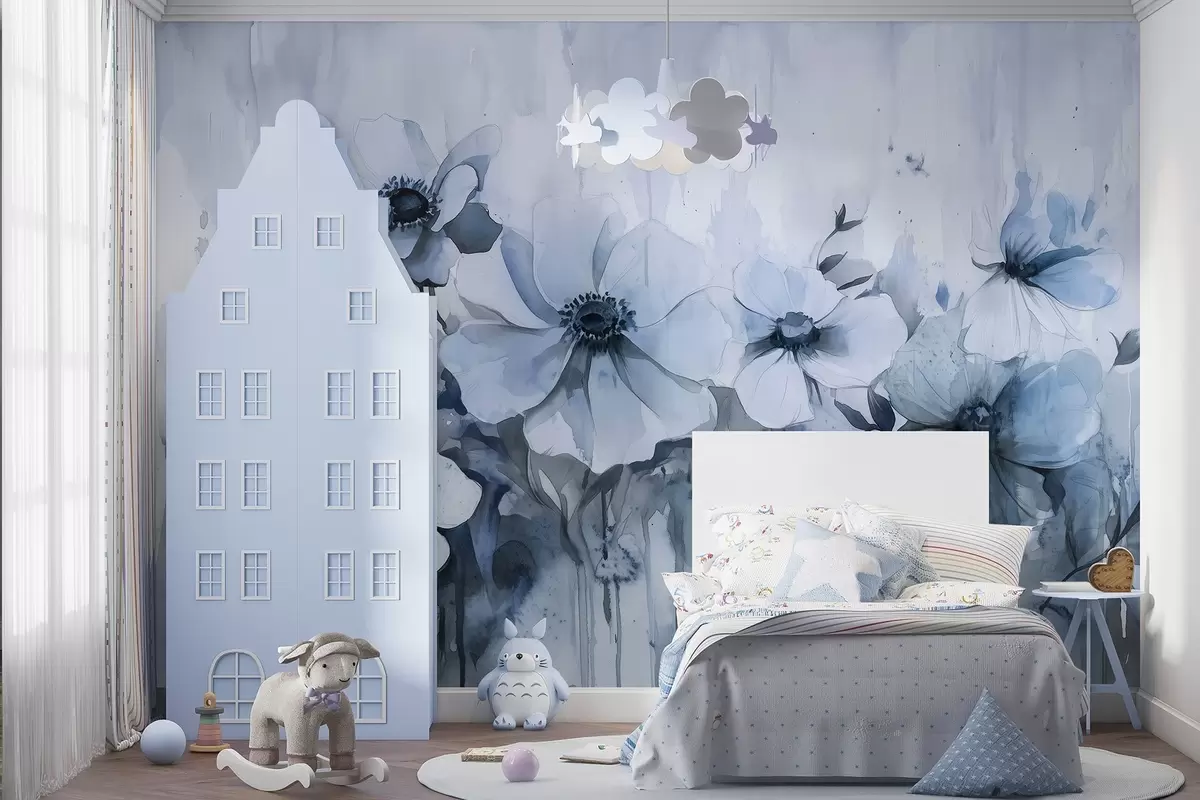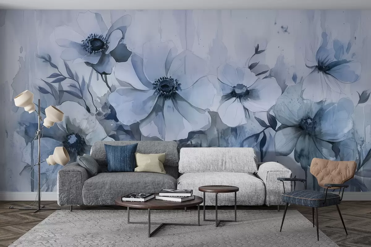 Фототапет Рустикални цветя, рисунка в акварелен стил, сини цветове Nr w02487v1