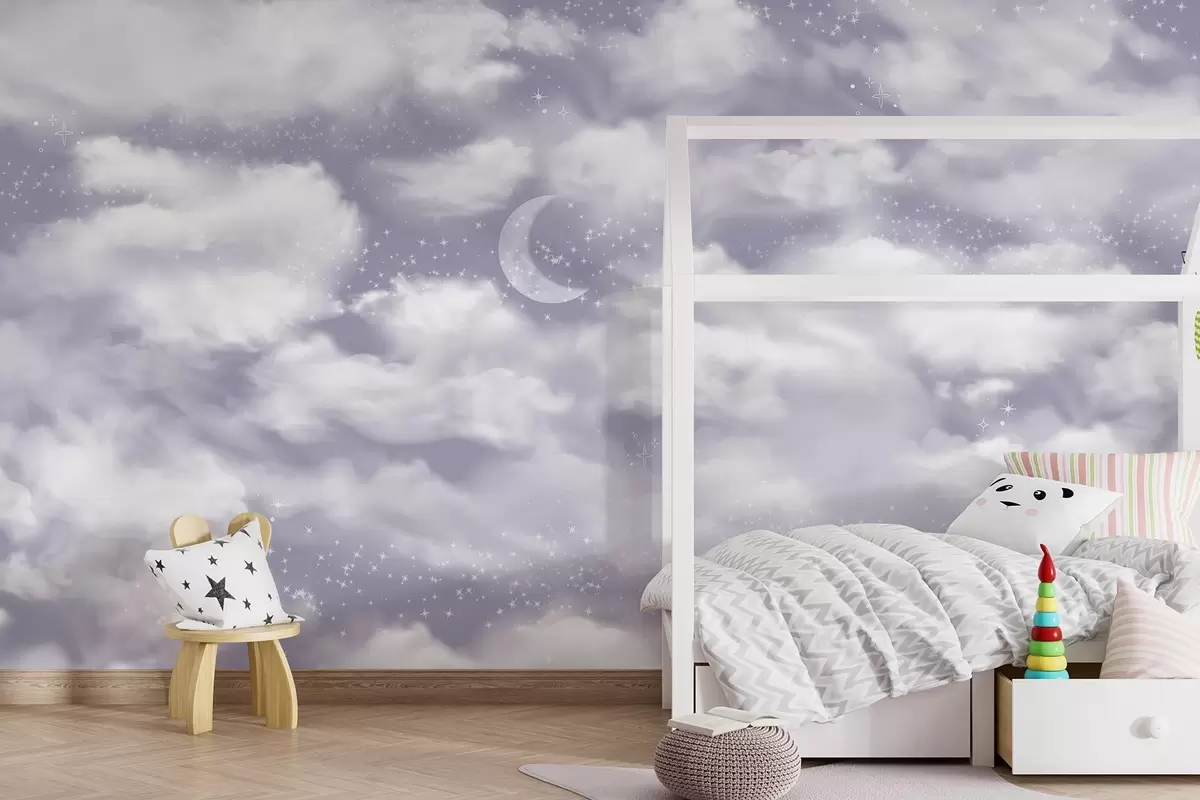 Фототапет Звездно небе с луна и облаци, мечтателно, ефирно, в меки лилави цветове Nr w02515v4