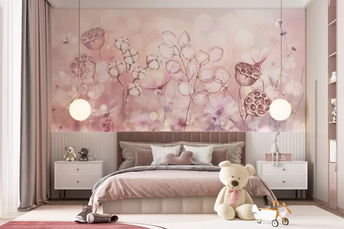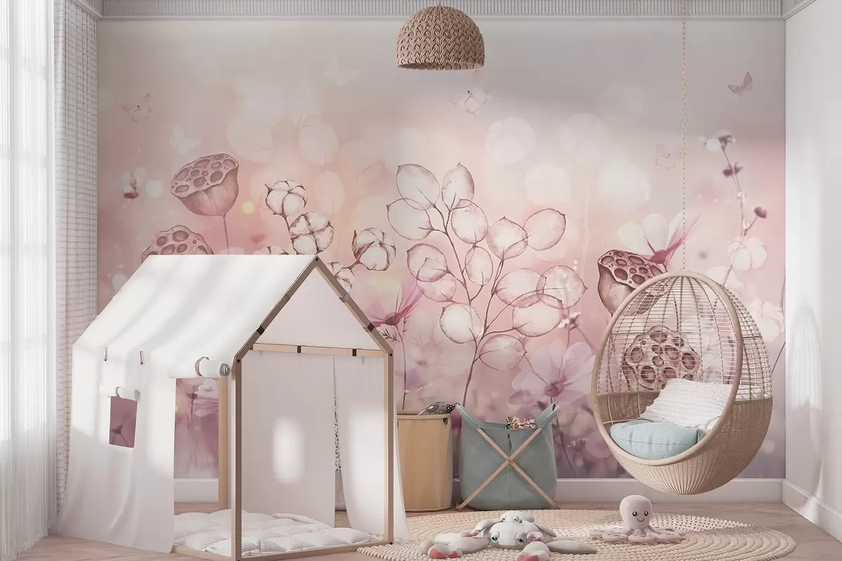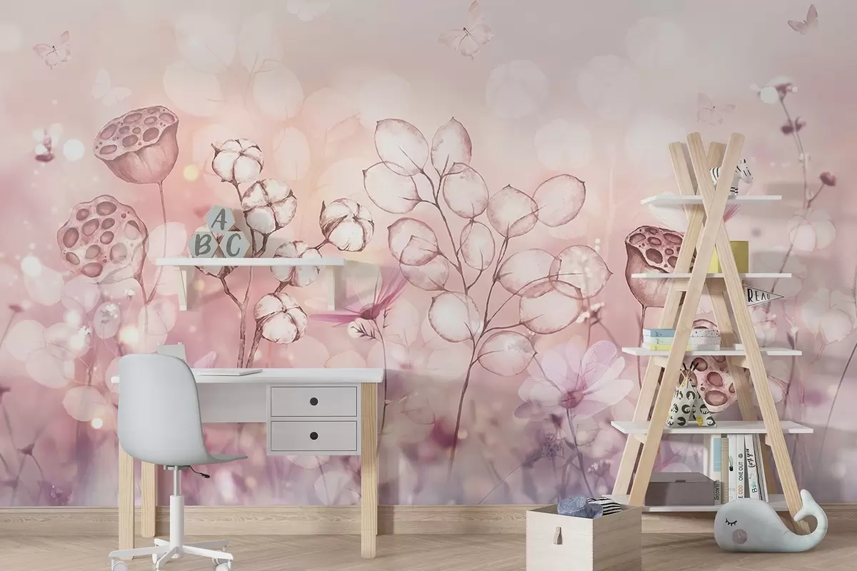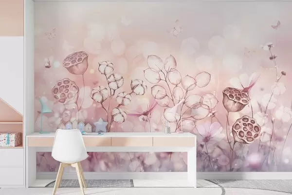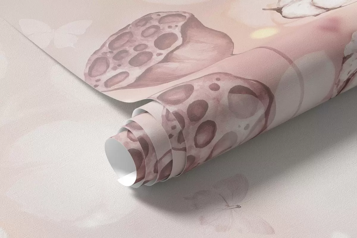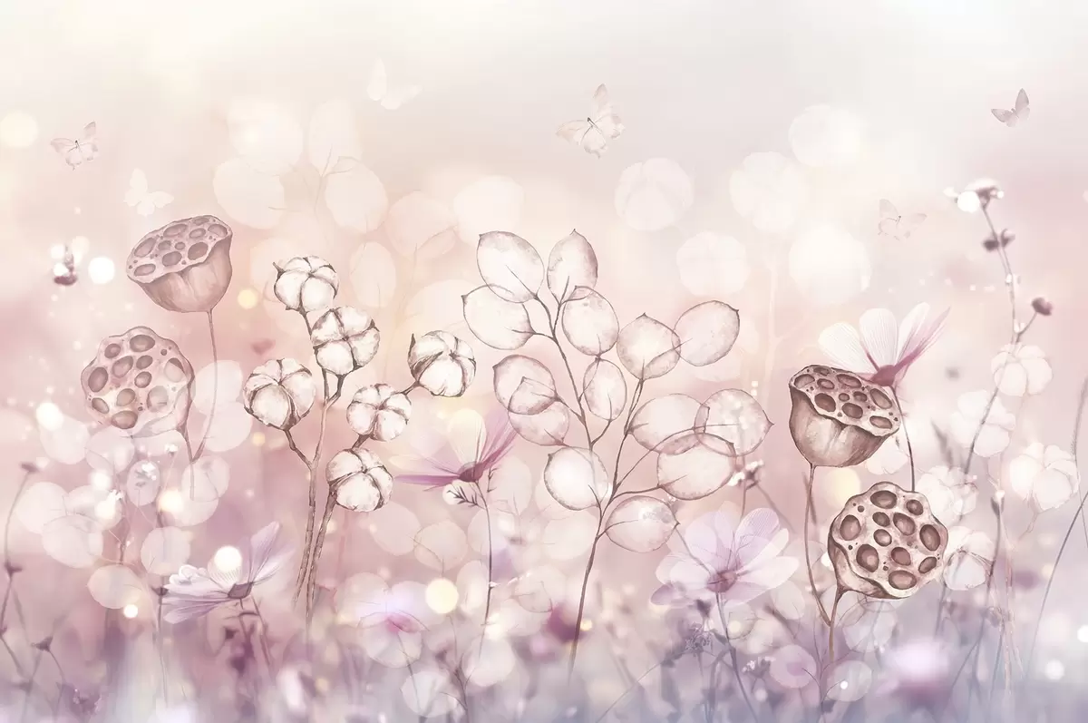 Фототапет Мечтателна цветна градина, пеперуда, памучни цветя, лотоси, розови цветове Nr w02516