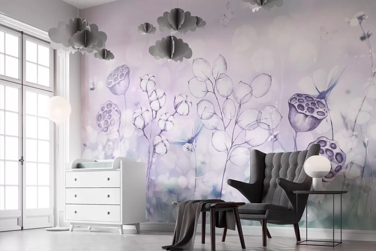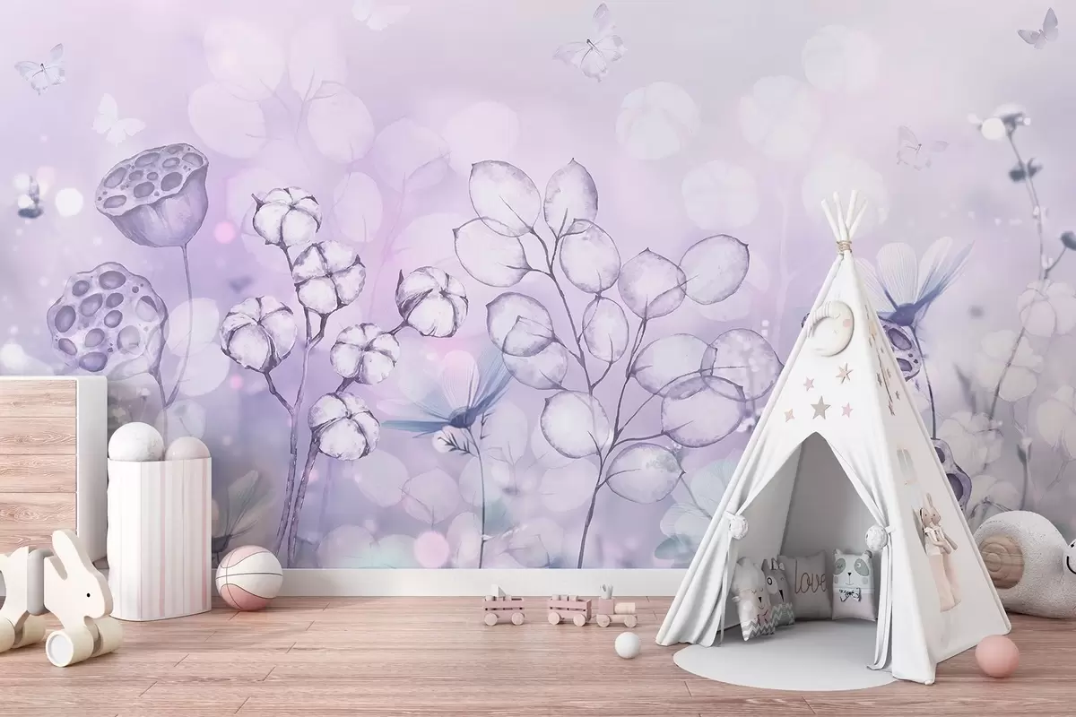Фототапет Мечтателна цветна градина, пеперуда, памучни цветя, лотоси, лилави цветове Nr w02516v1