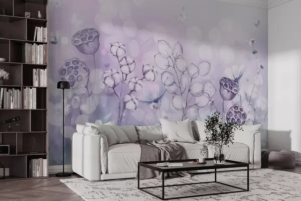 Фототапет Мечтателна цветна градина, пеперуда, памучни цветя, лотоси, лилави цветове Nr w02516v1