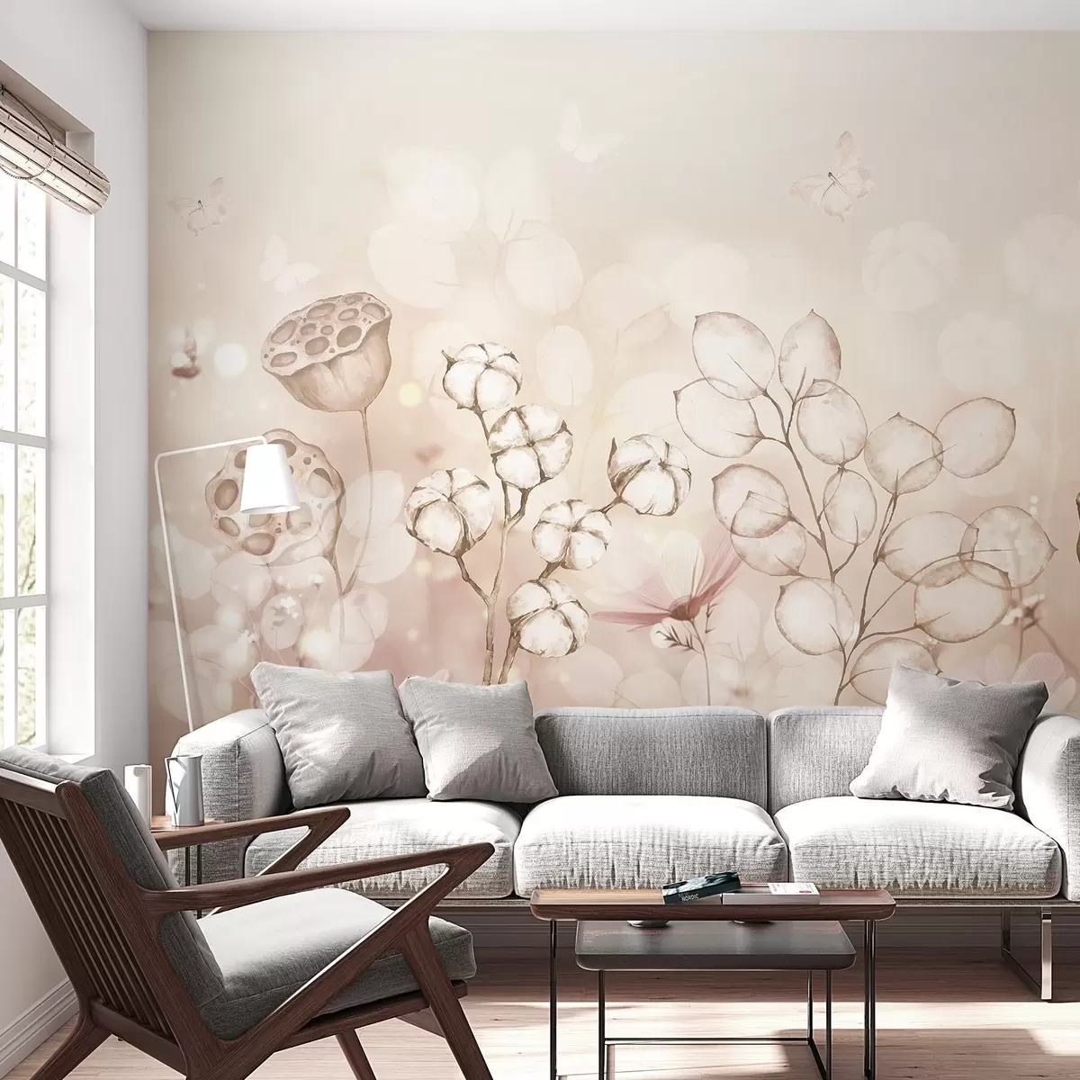 Фототапет Мечтателна цветна градина, пеперуда, памучни цветя, лотоси, бежови цветове Nr w02516v3