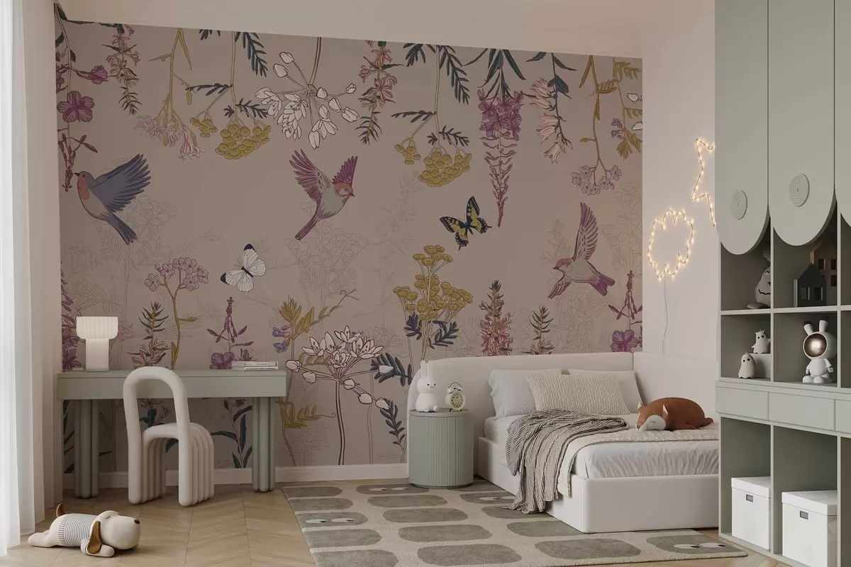 Фототапет ансамбъл от диви цветя и птици на бежов фон Nr w02634