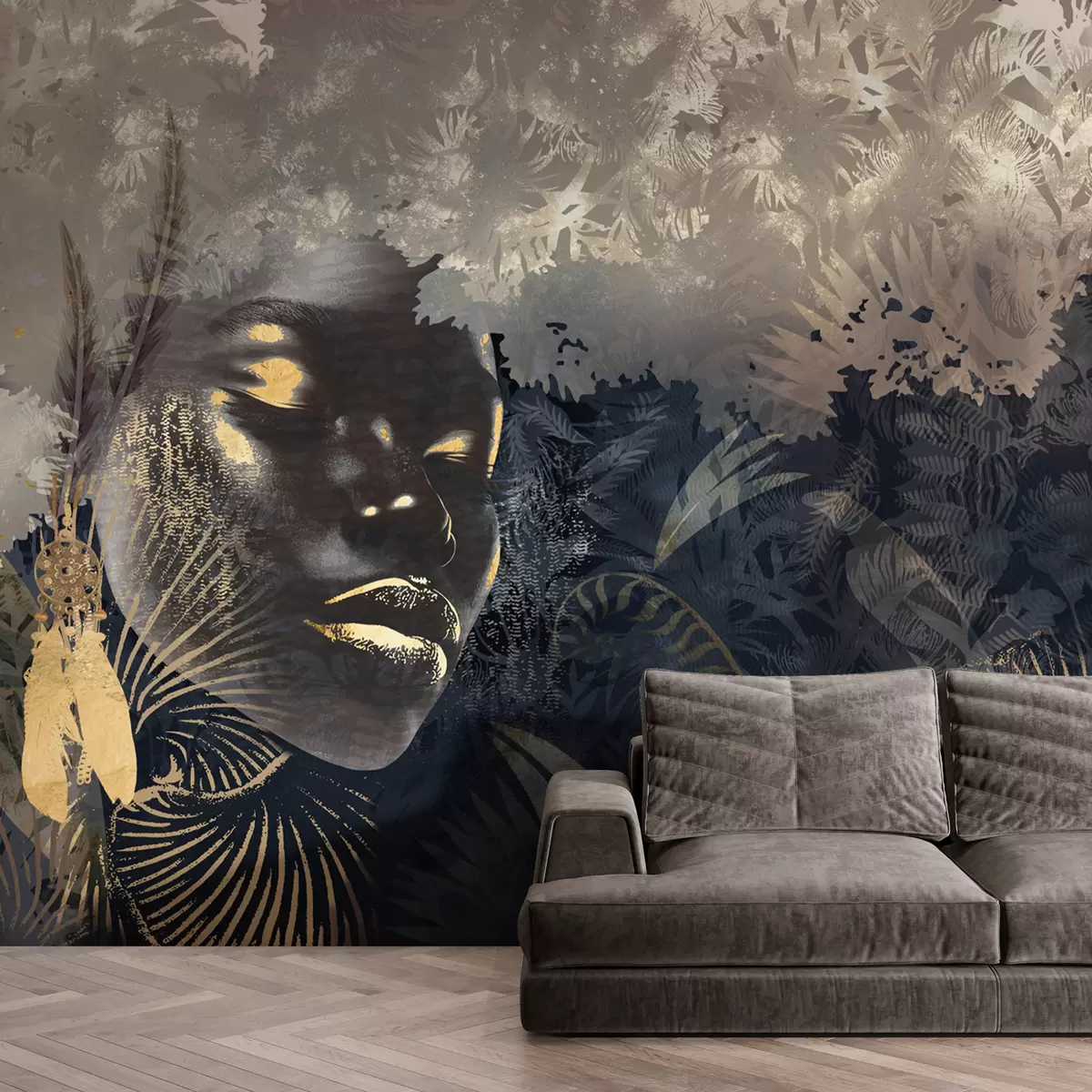 Фототапет Магическа Африка с дъждовна гора, момичешки и векторни елементи със син оттенък Nr w02642v1