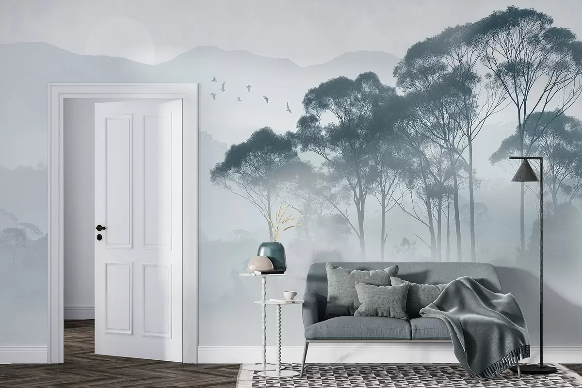 Фототапет Дървета в мъглата, природни пейзажи, птици, слънце, сини цветове Nr w02740v1