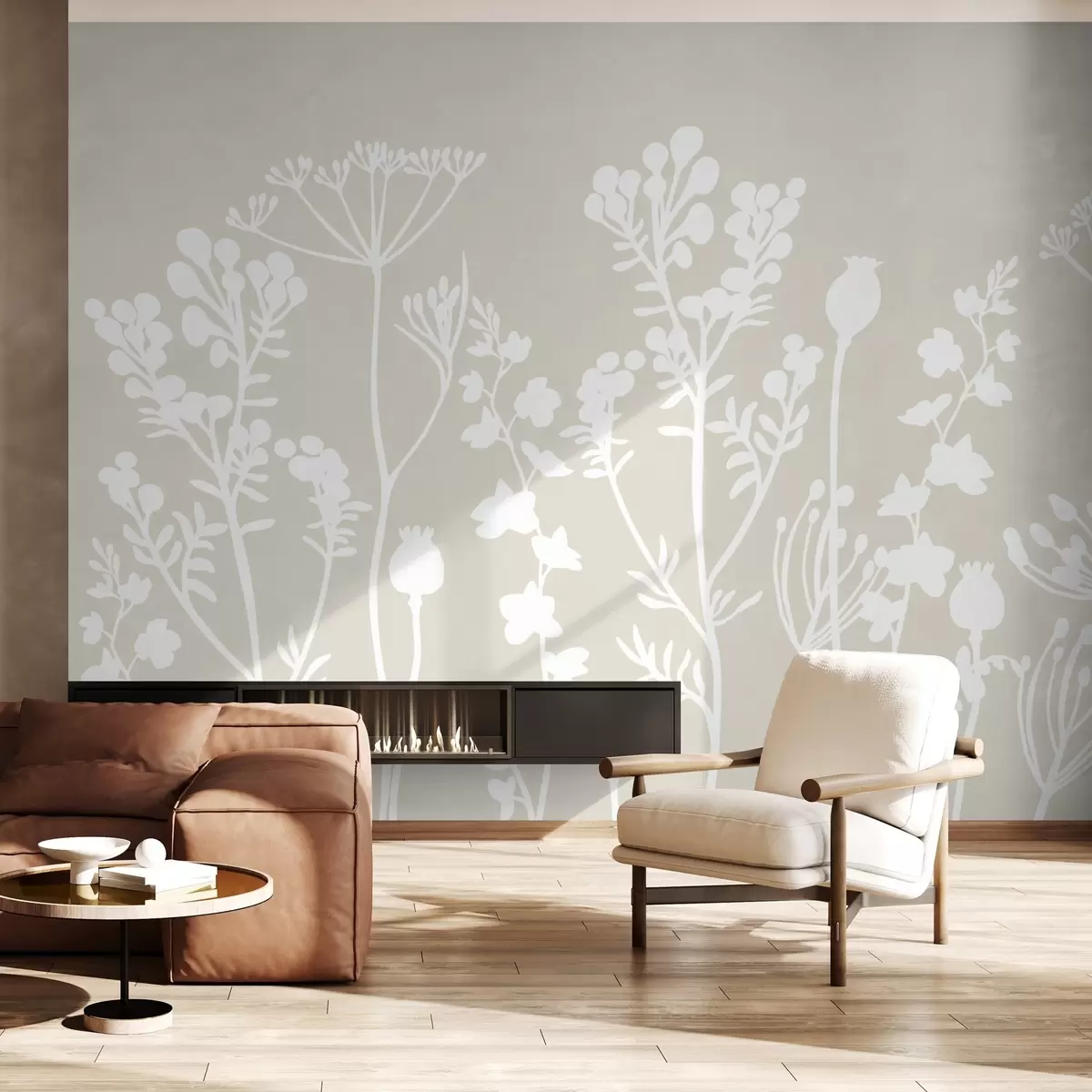 Фототапет бели силуети на цветя на бежов фон Nr w02809v2