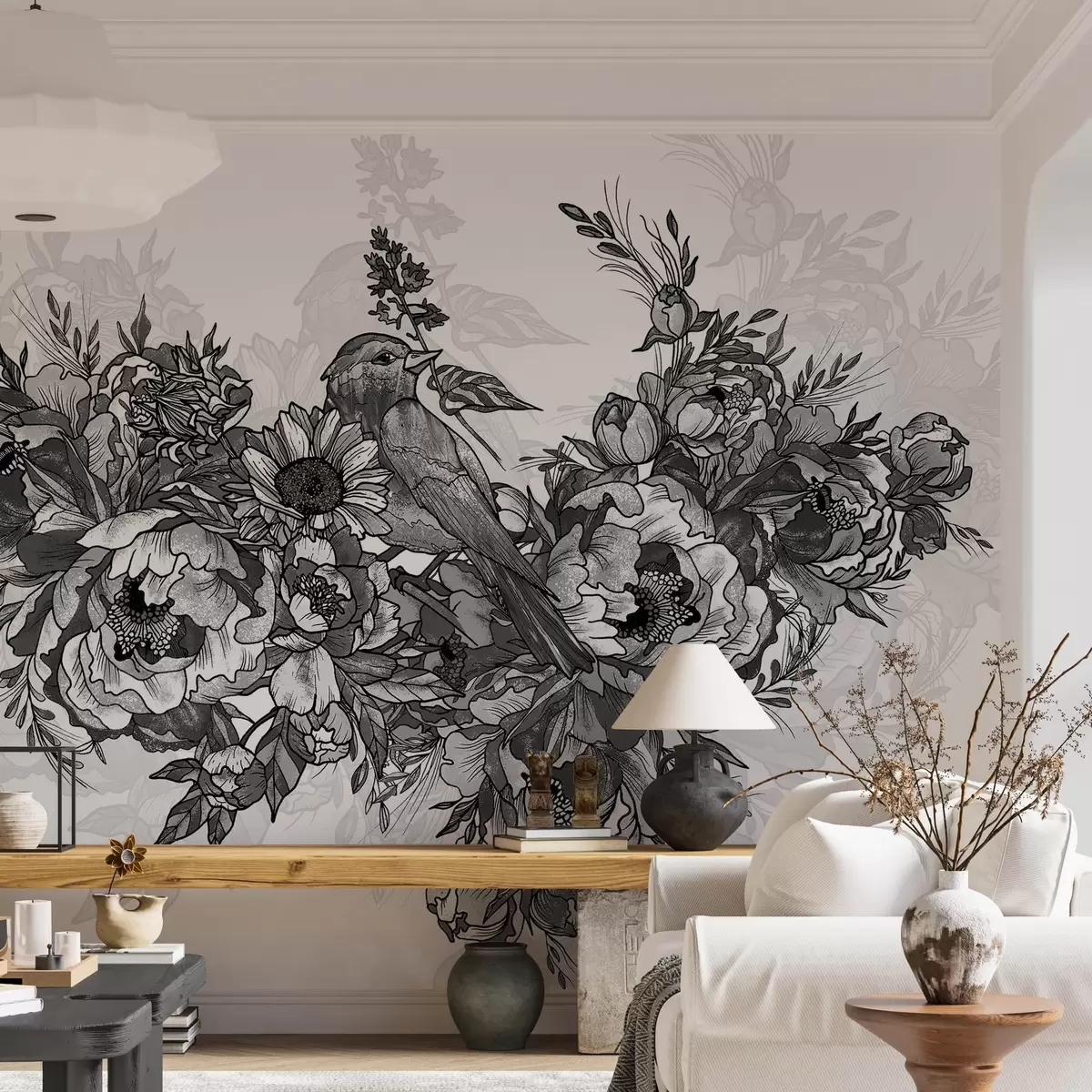 Фототапет Монохромна композиция от цветя и птици Nr w02834