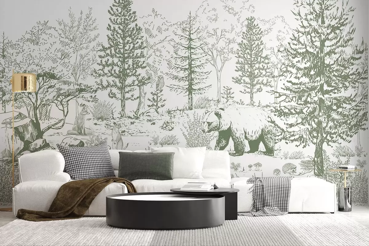 Фототапет Горски живот, дървета, диви животни, мечка, лисица, бухал, храсти, рисунка с молив, зелени цветове Nr w02929v2
