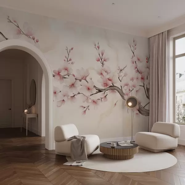 Фототапет Деликатен клон на черешов цвят с нежни розови цветове на светъл фон Nr w03079