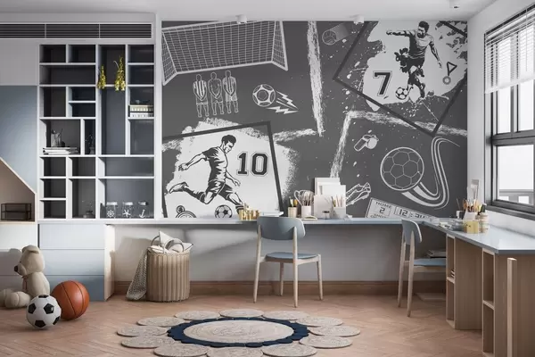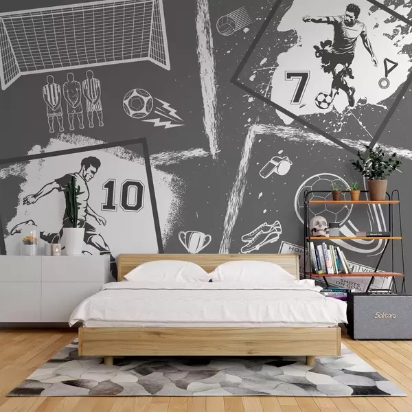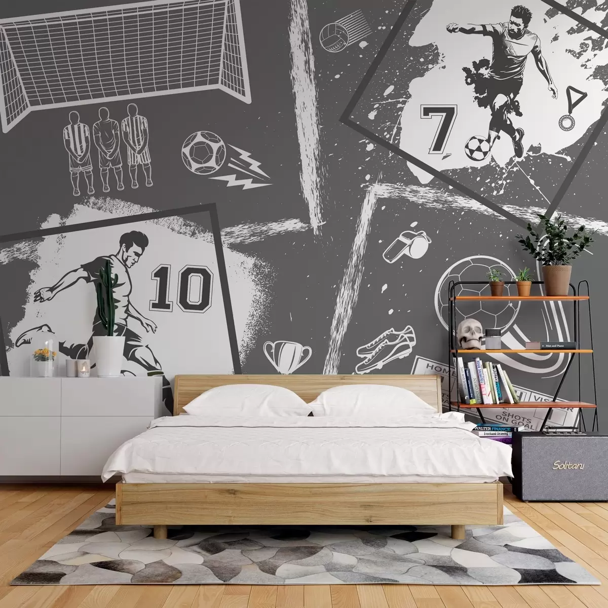 Фототапет Футболисти, топка и други футболни атрибути в сиви тонове Nr w03122v1