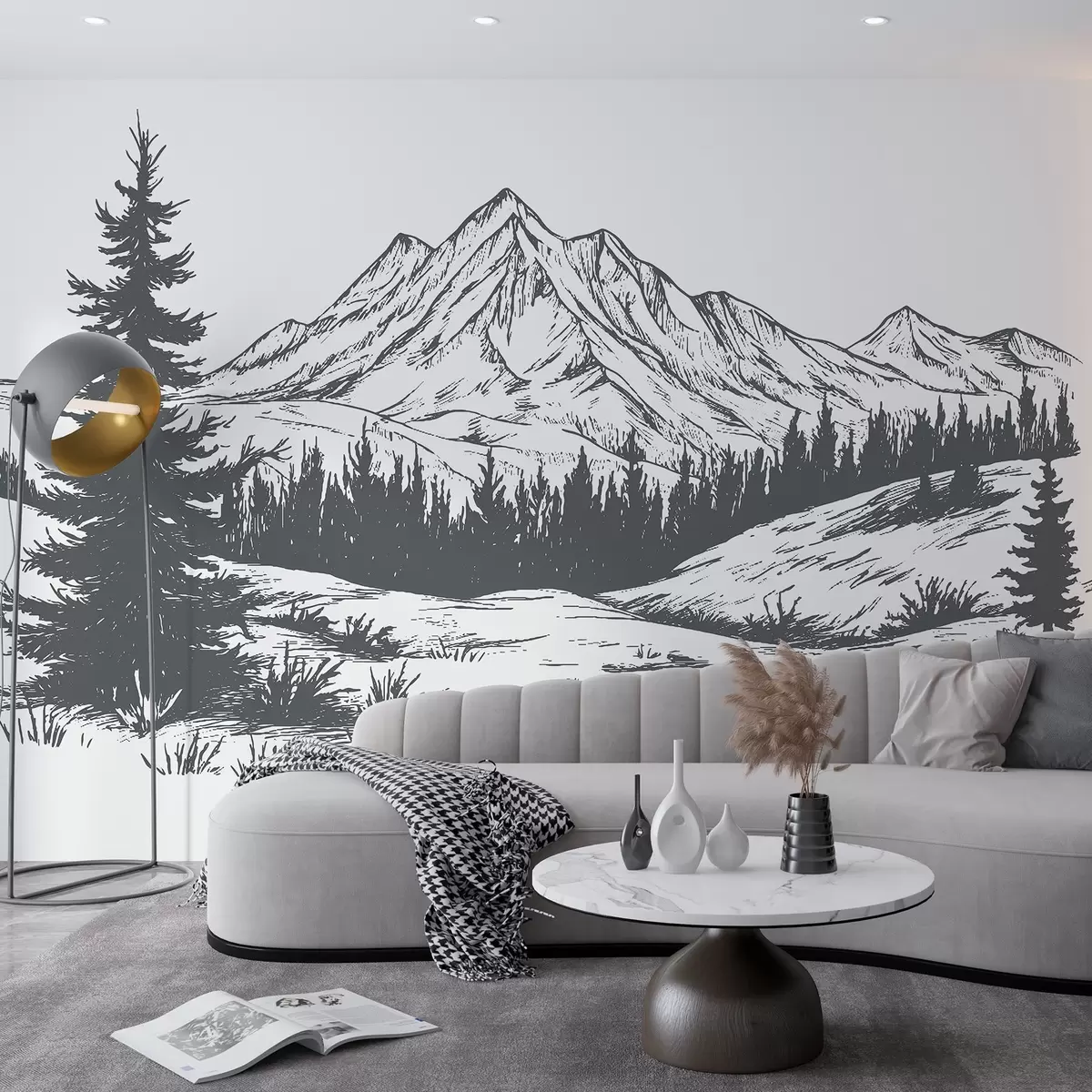 Фототапет Планински пейзаж с борови дървета, гора, природа, тъмно сив цвят Nr w03344
