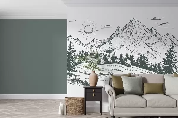 Фототапет Рисунка на планини, природни пейзажи, гора, дървени къщи, зелен цвят Nr w03347