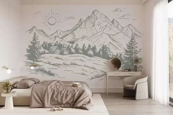 Фототапет Планини рисунка, природни пейзажи, гора, дървени къщи, ментов цвят Nr w03347v1