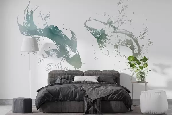 Фототапет Акварелна риба, ориенталски стил, черешово дърво, зелени цветове Nr w03447v2