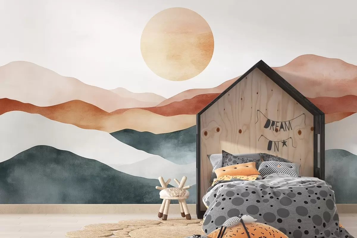 Фототапет Акварелни планини със слънцето, бохо стил, червено, оранжево, сиво Nr w03551
