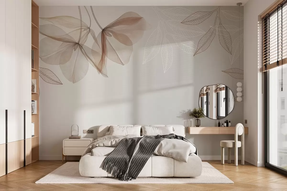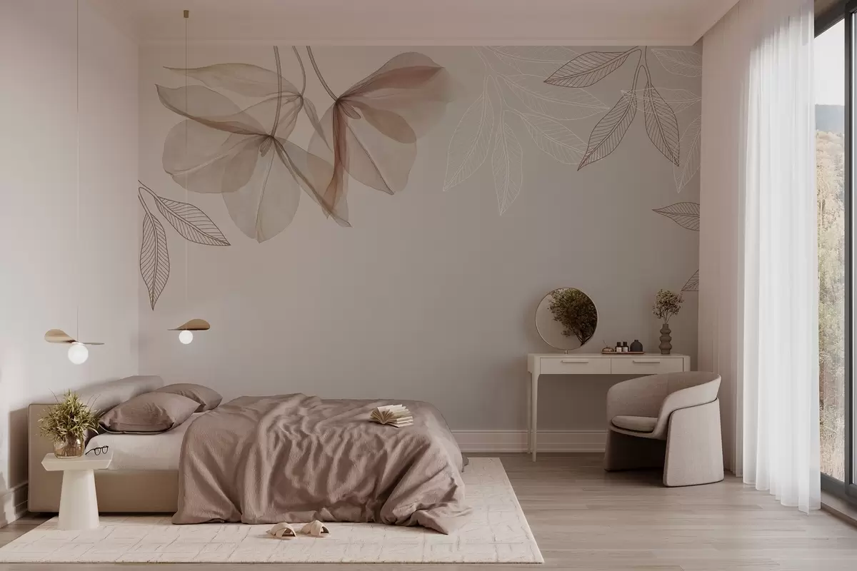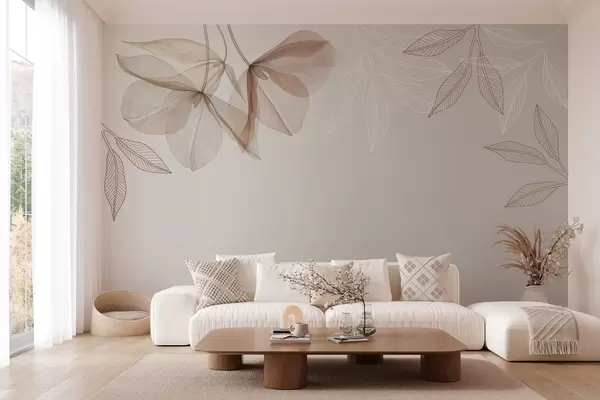 Фототапет деликатни полупрозрачни цветя и листа в нюанси на мока Nr w03616v3