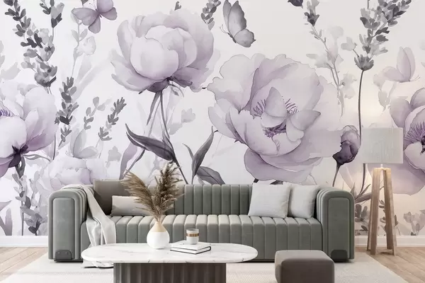 Фототапет Цветна поляна, божури, лавандула, пеперуди, акварел, цветове на зениците Nr w03668v3