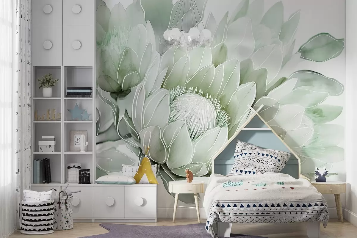 Фототапет Красиви цветя на протея, рисунка на линия, тропически, зелени цветове Nr w03669v2