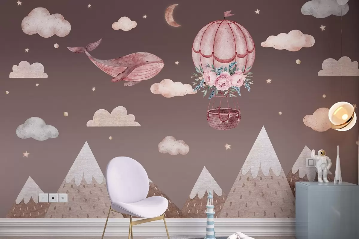 Фототапет Сладък кит с въздушен балон, тъмно небе с облаци, планини, акварел, розови цветове Nr w03673v1