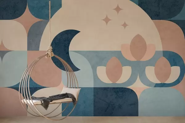 Фототапет геометрична абстракция, в която меките форми плавно се преплитат със символи на луната, цветя и звезди Nr w03723