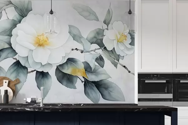 Фототапет Цветя на камелия на клона в акварелен стил, естествени цветове Nr w03761