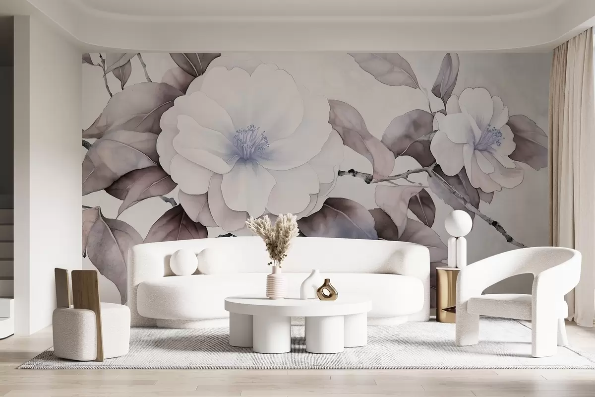 Фототапет Цветя на камелия на клона в акварелен стил, лилави цветове Nr w03761v1