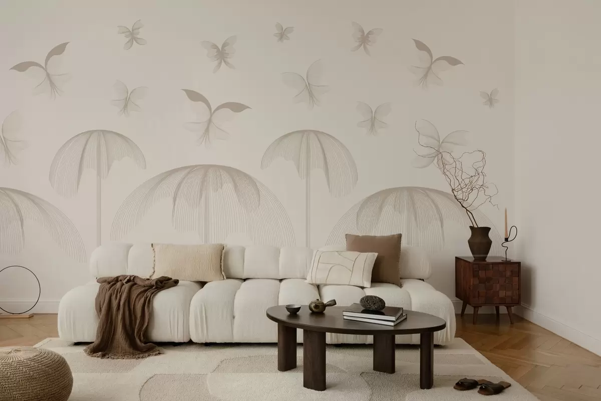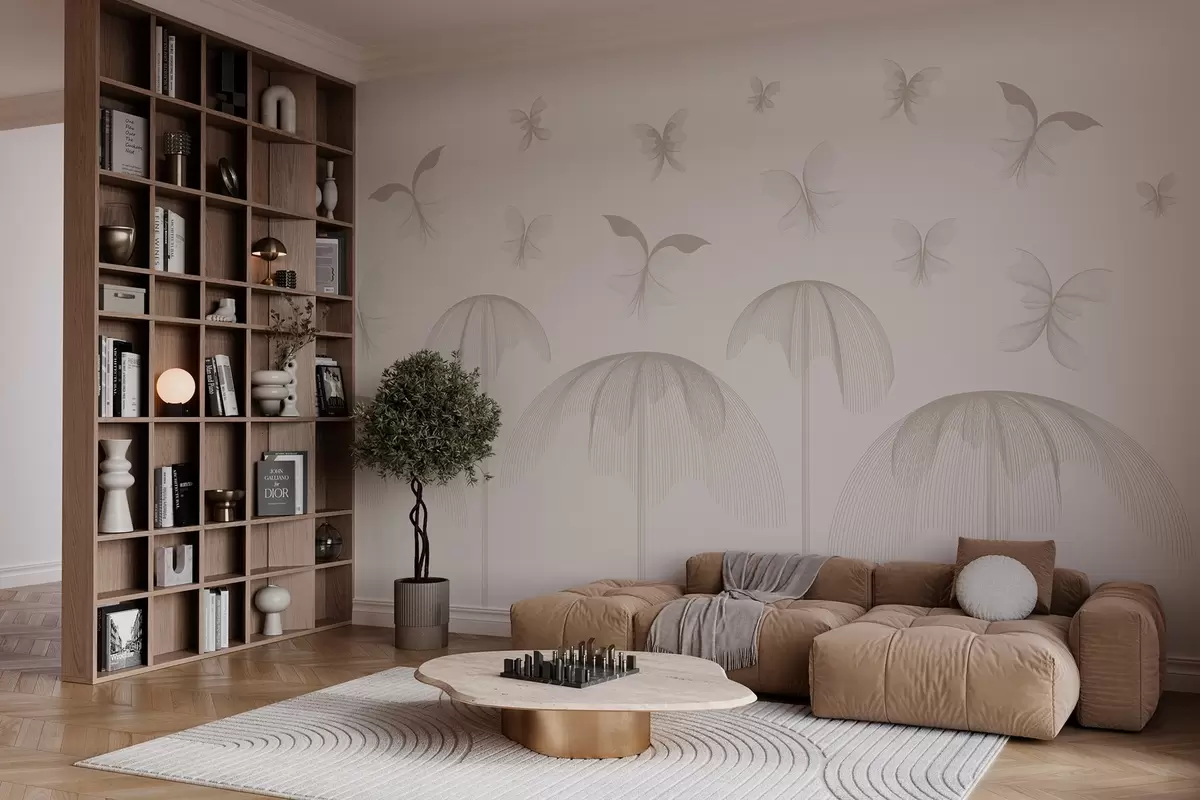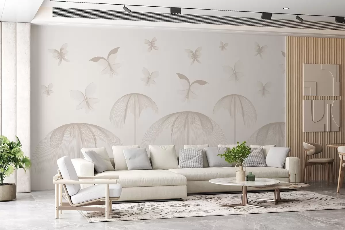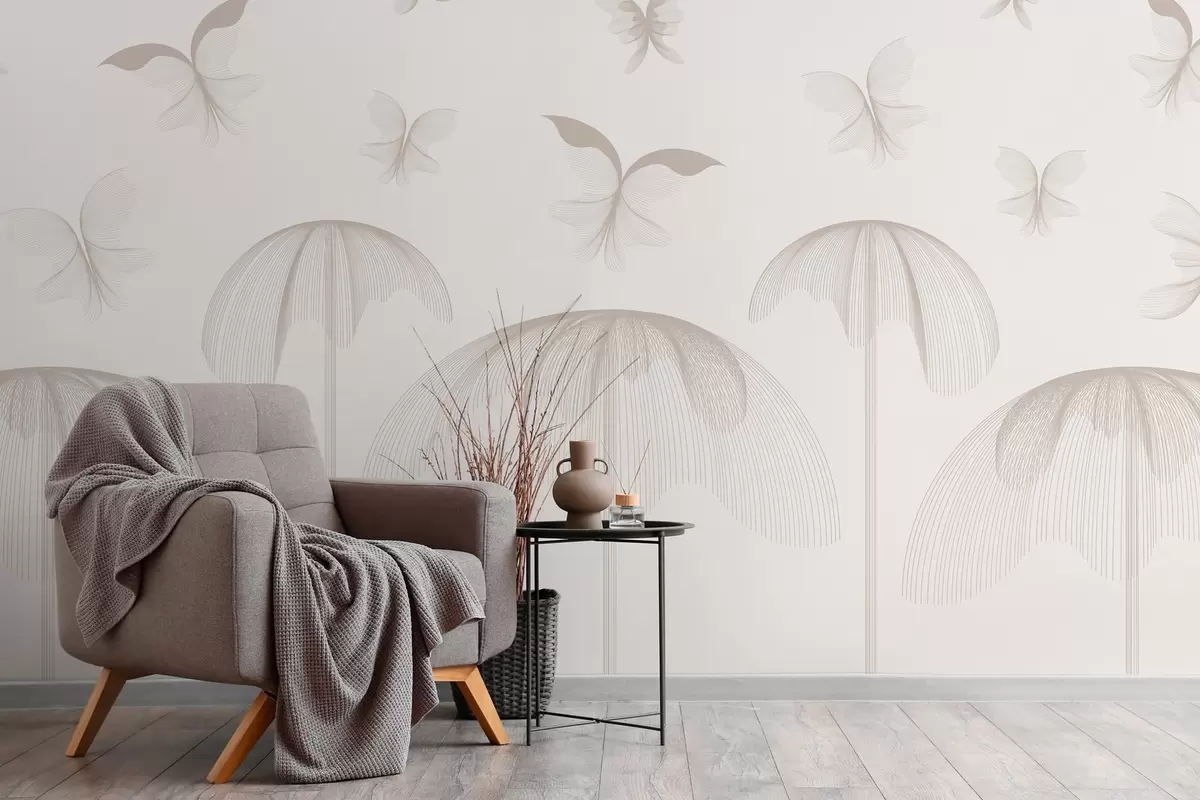 Фототапет минималистичен линеен тапет пеперуди и фонтани на млечен фон Nr w03762