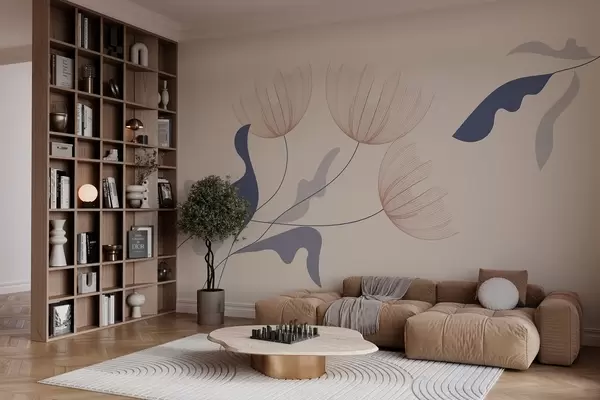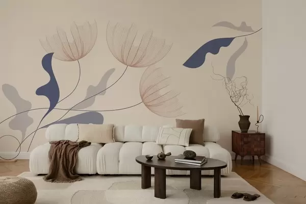 Фототапет елегантни минималистични цветя в сини тонове на бежов фон Nr w03763