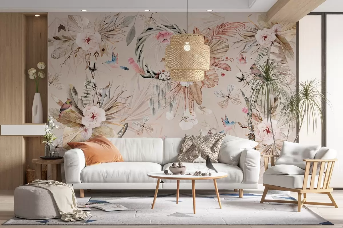 Фототапет Орнамент в бохо стил с цветя божур и птици, акварелен стил, меки цветове Nr w03885v3