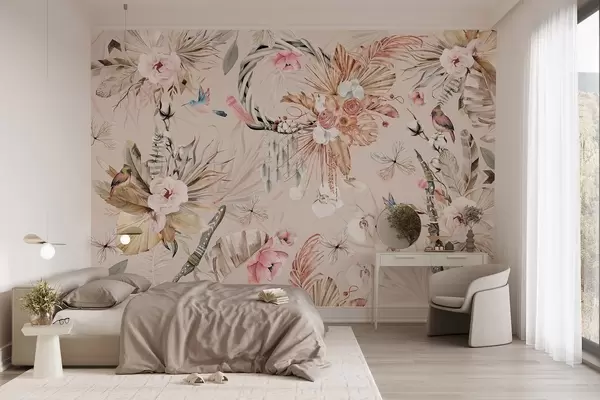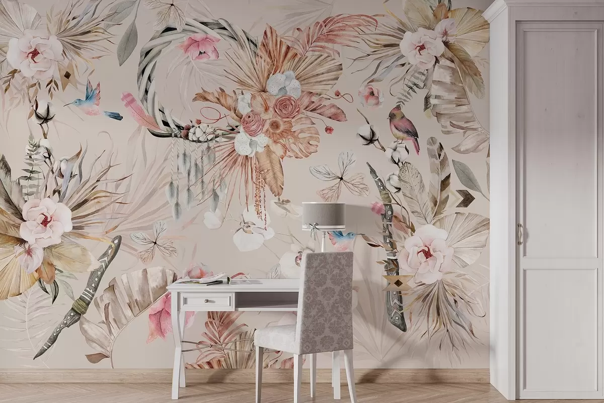Фототапет Орнамент в бохо стил с цветя божур и птици, акварелен стил, меки цветове Nr w03885v3
