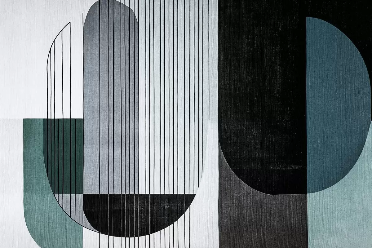 Фототапет модерна абстрактна геометрична композиция с припокриващи се форми и вертикални линии, тънки линии, запълващи трапецовидни и овални форми, мека текстилна текстура, топли приглушени тонове като маслинено зелено, сиво, бежово и въглен, фини ефекти на прозрачност между формите Nr w03937v2