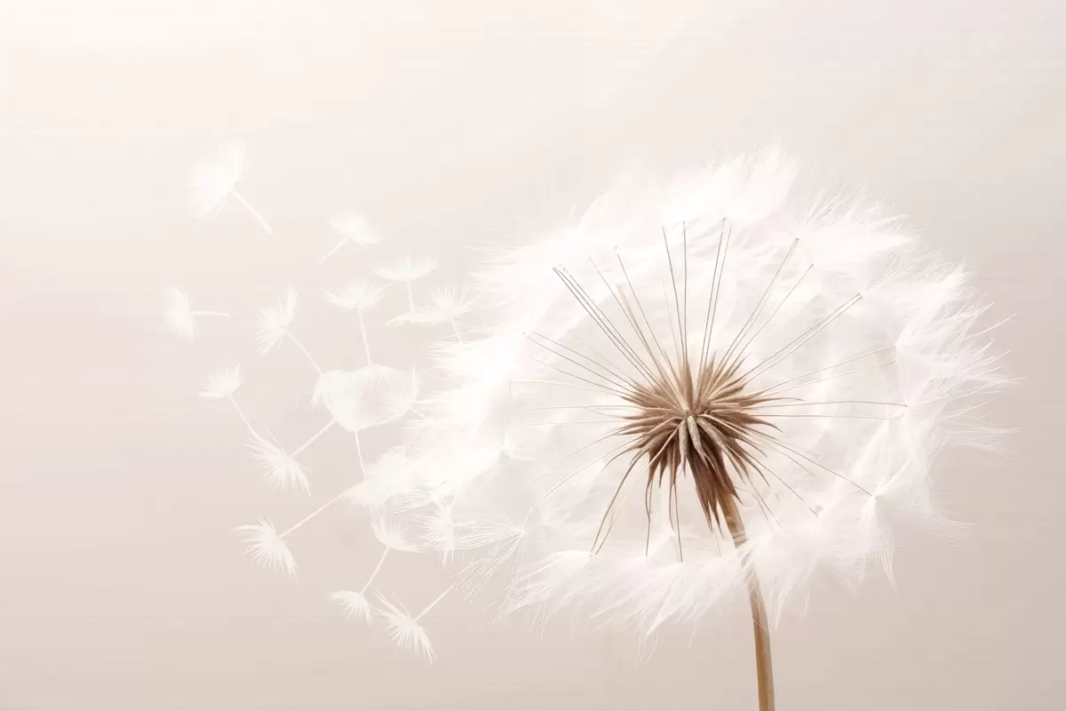 Фототапет Модерна мека флорална композиция с напълно разцъфнала глава на глухарче и плаващи семена, разположени върху деликатна текстура, наподобяваща текстил Nr w03939