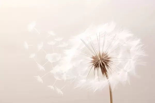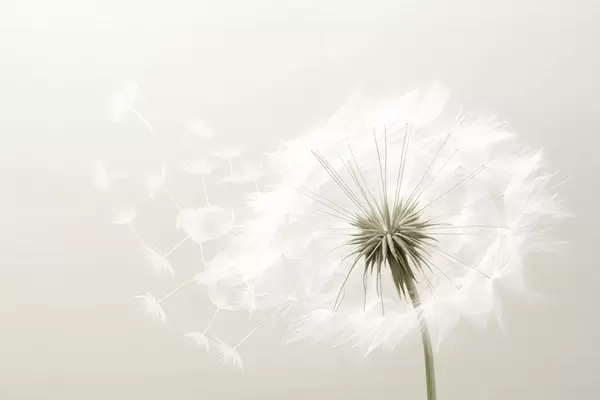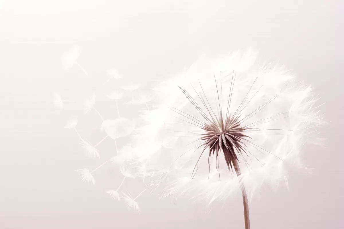 Фототапет Модерна мека флорална композиция с напълно разцъфнала глава на глухарче и плаващи семена, разположени върху деликатна текстура, наподобяваща текстил Nr w03939v2