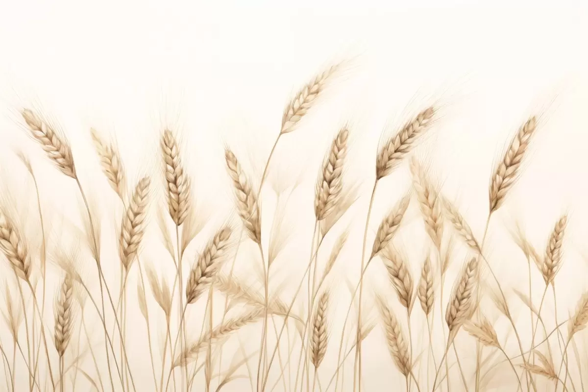 Фототапет деликатна ботаническа илюстрация на пшенични стъбла, ръчно рисуван стил, фини линии с пастелна тебеширена текстура, мека сепия и земни кафяви тонове, бял фон, симетрична елегантна композиция, естествена естетическа скица Nr w03943