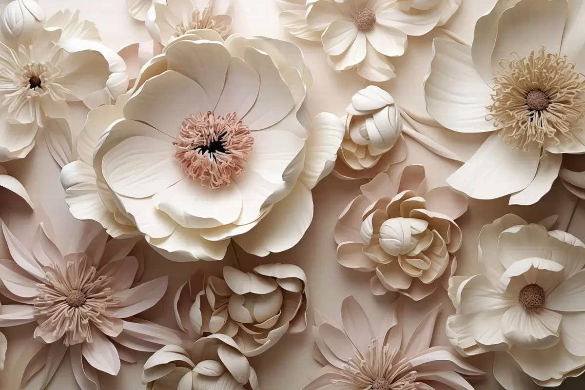 Фототапет Обемна флорална композиция с нежни листенца, наподобяващи хартия или вдъхновени от текстил, в тонове на слонова кост, ванилия и руж, разположени върху топло бежово платно. Nr w03945