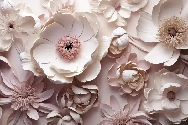 Фототапет Обемна флорална композиция с нежни листенца, наподобяващи хартия или вдъхновени от текстил, в тонове на слонова кост, ванилия и руж, разположени върху топло бежово платно. Nr w03945v1