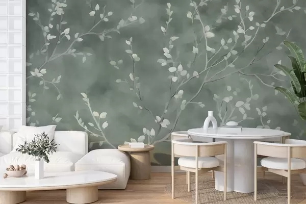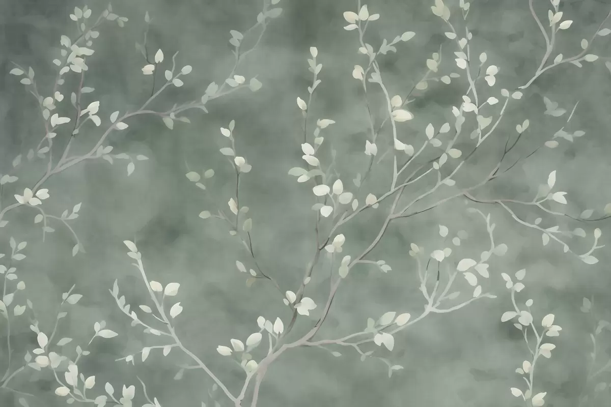 Фототапет минималистичен ръчно рисуван дизайн на тапет с меки бели клони на дървета с деликатни листа, органично разклоняващи се върху приглушен зелен фон, фини ботанически линии в естествен поток Nr w03949
