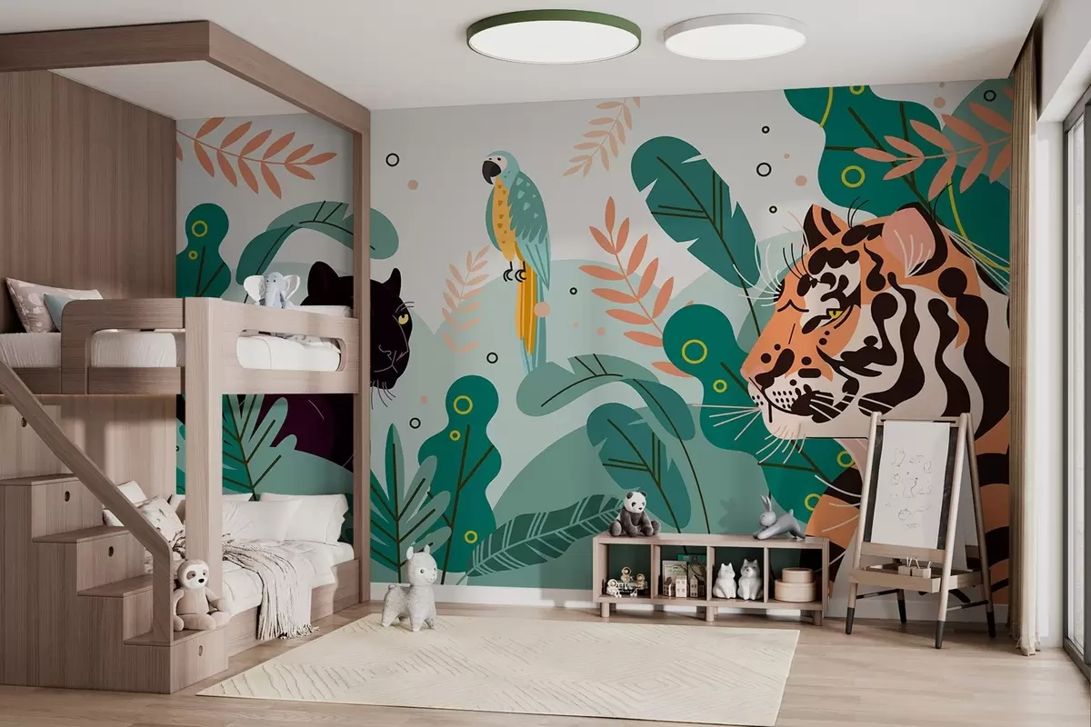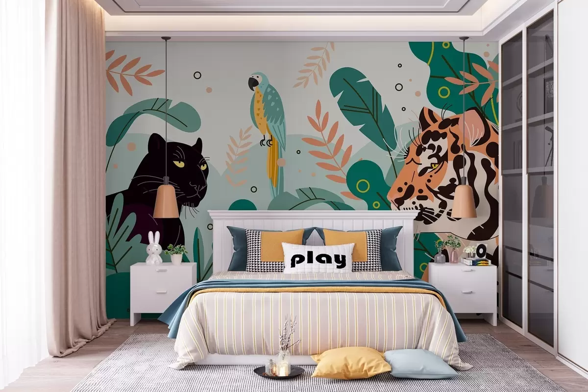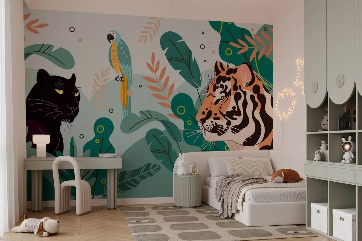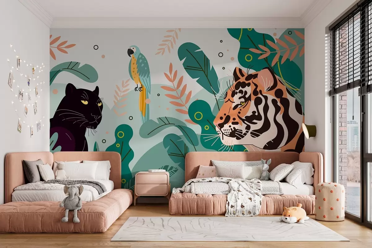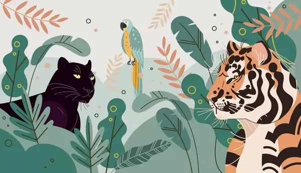 Фототапет джунгла с тигър, пантера и папагал Nr w03958